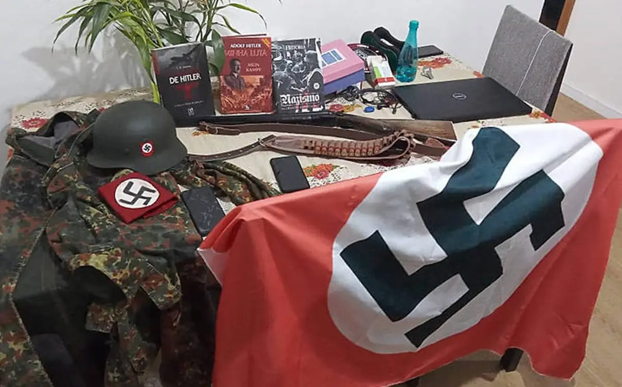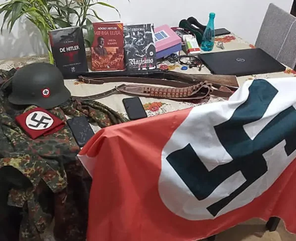 Armas, uniformes e bandeiras nazistas apreendidos com suspeitos de integrarem um grupo neonazista em Santa Catarina, em 2022 – Polícia Civil de Santa Catarina
