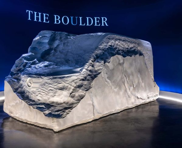 O nome é um trocadilho de “boulder” (“pedregulho”, em inglês) com “bolder” (“mais ousado”). A escultura — talhada a partir de um bloco maciço de “material com aparência de pedra”, segundo a Mercedes — impressiona pelas dimensões: 6,50 metros de comprimento, 2,75 metros de altura e 2,50 metros de largura.